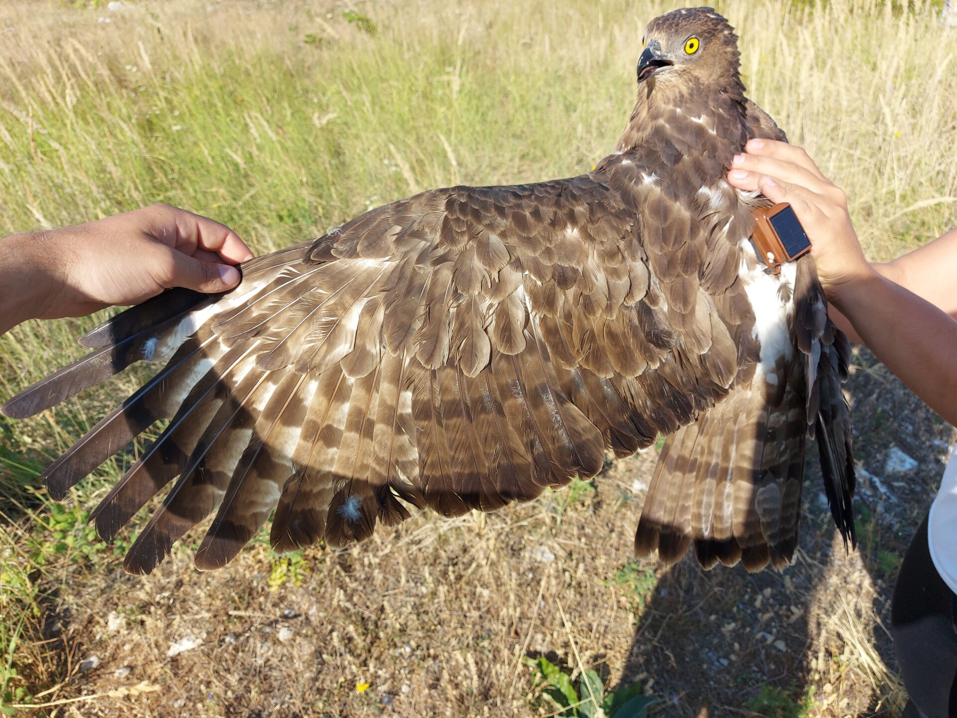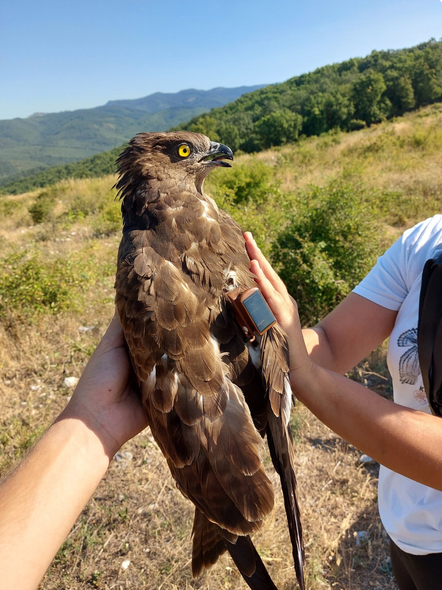 2023 augusztusában pedig egy, a Fővárosi Állat- és Növénykertbe idei fiókaként bekerült darázsölyvet sikerült megjelölnünk, amely repatriációra (Repatriációról akkor beszélnek, amikor mesterséges körülmények között nevelt vagy tartott egyedeket a természetes körülményekhez való alkalmazkodást elősegítő folyamat keretében fokozatosan szoktatnak a szabad területen való élethez. - a szerk.) érkezett a Baglyas-kő Vár Természetvédelmi Látogatóközpontba.