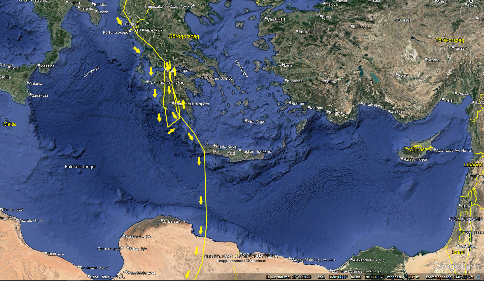 Szeptember 26-án aztán átkelt Korfu-szigetére, másnap pedig visszament a görög szárazföldre, ahol egy napot töltött, feltehetően táplálkozással. Útját tovább folytatta délnek a partok mentén, a tenger és a szárazföld felett. 28-án este már Zakintosz szigetének déli csücskén aludt. Másnap hatalmas fába vágta a fejszéjét, ugyanis nekivágott a Földközi-tengernek, és 550 km-t egyhuzamban repülve, szinte nyílegyenesen délnek tartva át is kelt azon.