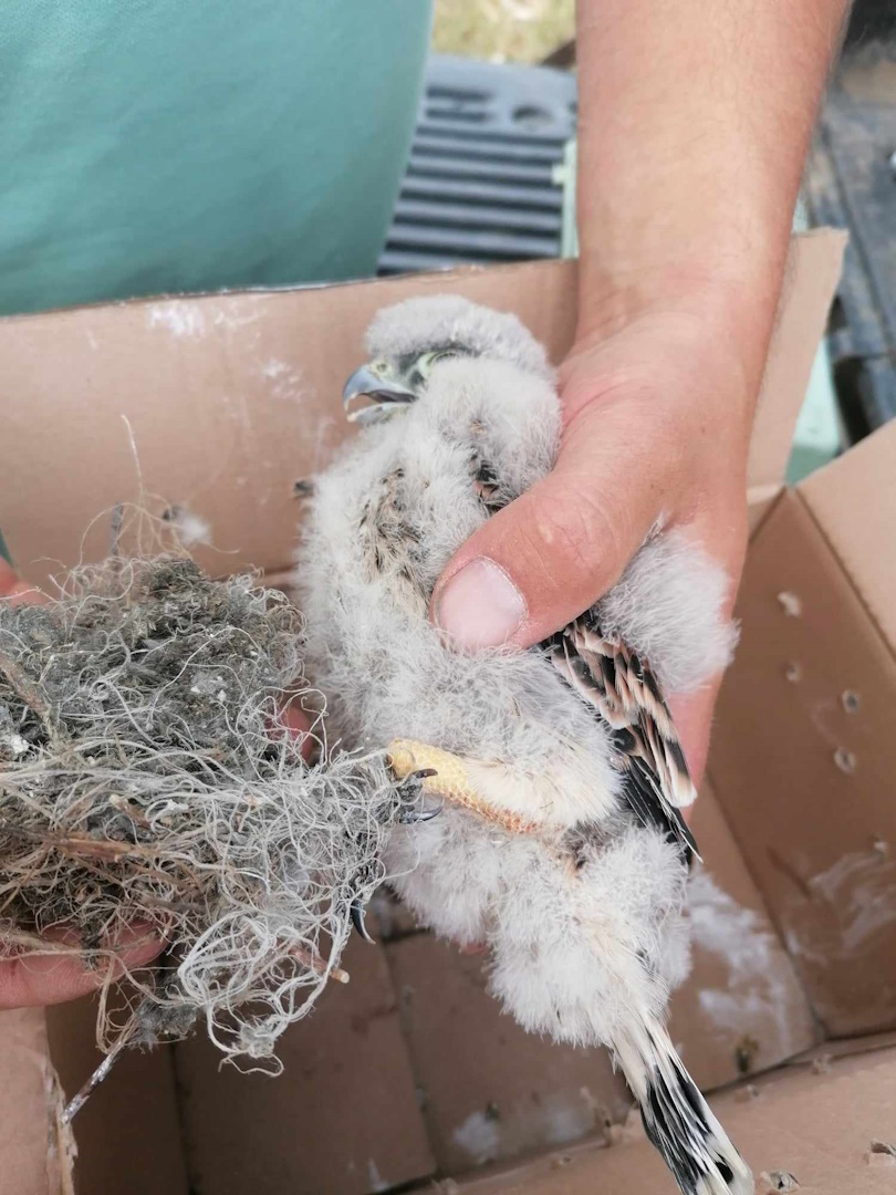 A fészekhez felérve elterveztük, hogy a mentett fióka visszahelyezése mellett a többi fióka gyűrűzését is megejtjük. Az egyik fiatal fészekből való kiemelése azonban váratlan akadályba ütközött. A gallyfészekbe ugyanis sajnos műanyag bálaháló is beleépült, amely rátekeredett a madár lábára és foglyul ejtette. A vörös vércsék nem építenek fészket, hanem általában varjúfélék régi fészkeit foglalják el. Ebben az esetben egy dolmányos varjú fészekben nevelkedtek a fiatalok, így feltehetőleg a dolmányos varjú építhette bele a bálahálót. Sajnos a háló annyira „beleérett” már a gallyak közé, hogy a fiókának esélye sem volt a szabadulásra. A háló annyira elszorította a lábát, hogy a madár lábfeje már teljesen elhalt.