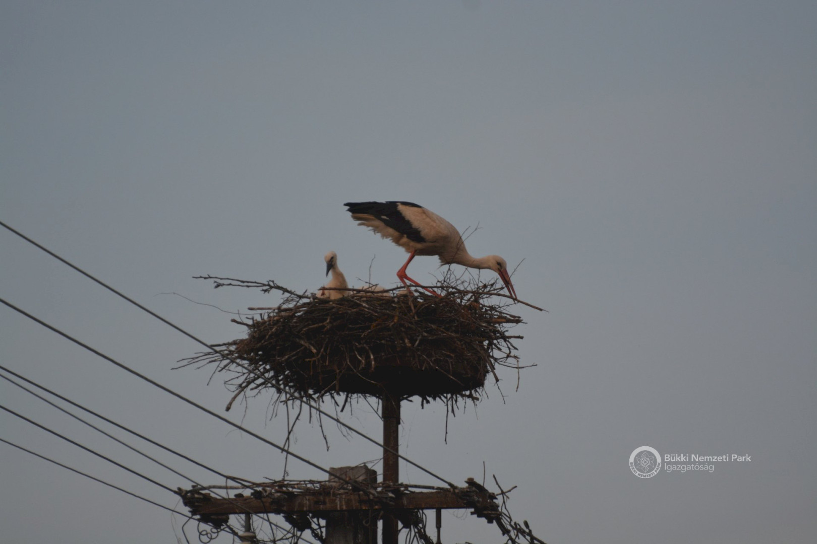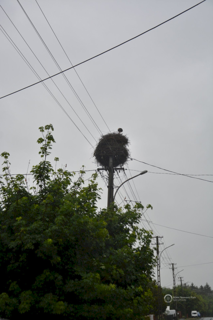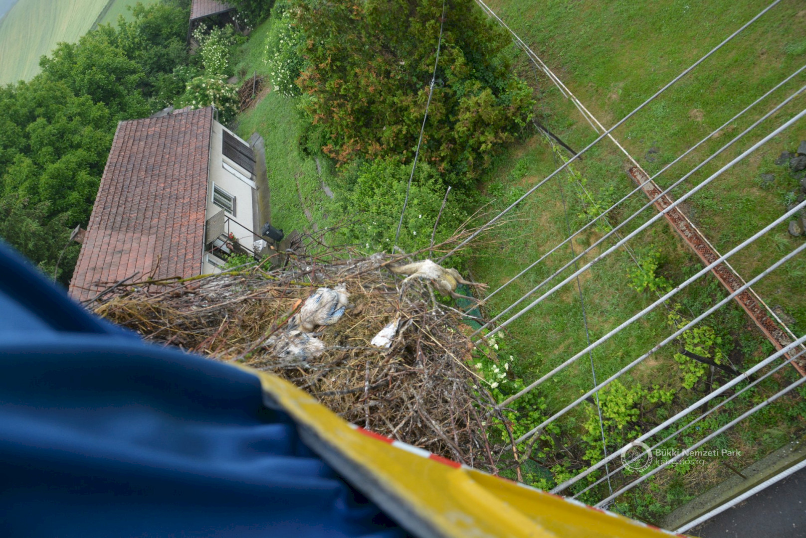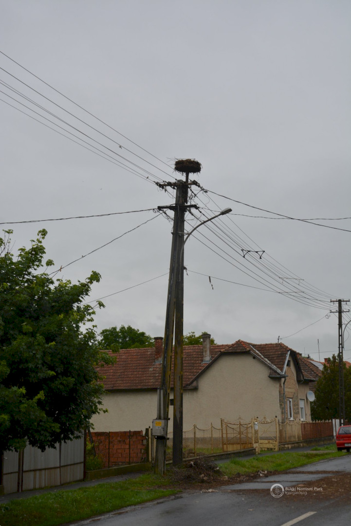 Sajnos a négyből az egyik fióka kiesett, egy másik pedig a fészekanyagban, illetve a vezetékekben akadt fenn, így mindketten elpusztultak. Viszont a két kisebb fészektestvérük benne maradt a megdőlt fészekcsészében. Néha kisebbnek lenni is lehet előny... A riasztás után a Nógrádi tájegység felvette a kapcsolatot az MVM-ÉMÁSZ-szal és egy emelőkosaras gépjármű formájában meg is érkezett a segítség. Az áramtalanítás után először a fiókákat helyeztük biztonságba, majd a fészekanyag leszakadt részeit távolítottuk el. Ezután a fészektartón lévő megmaradt fészekanyag mennyiségét csökkentettük az optimális szintre, és egy új fészekcsészét alakítottunk ki benne, ahová visszahelyeztük a két életben maradt fiókát. Az öreg madarak végig figyelték a mentési, helyreállítási mozzanatokat, majd ők maguk is hordani kezdték a fészekanyagot.