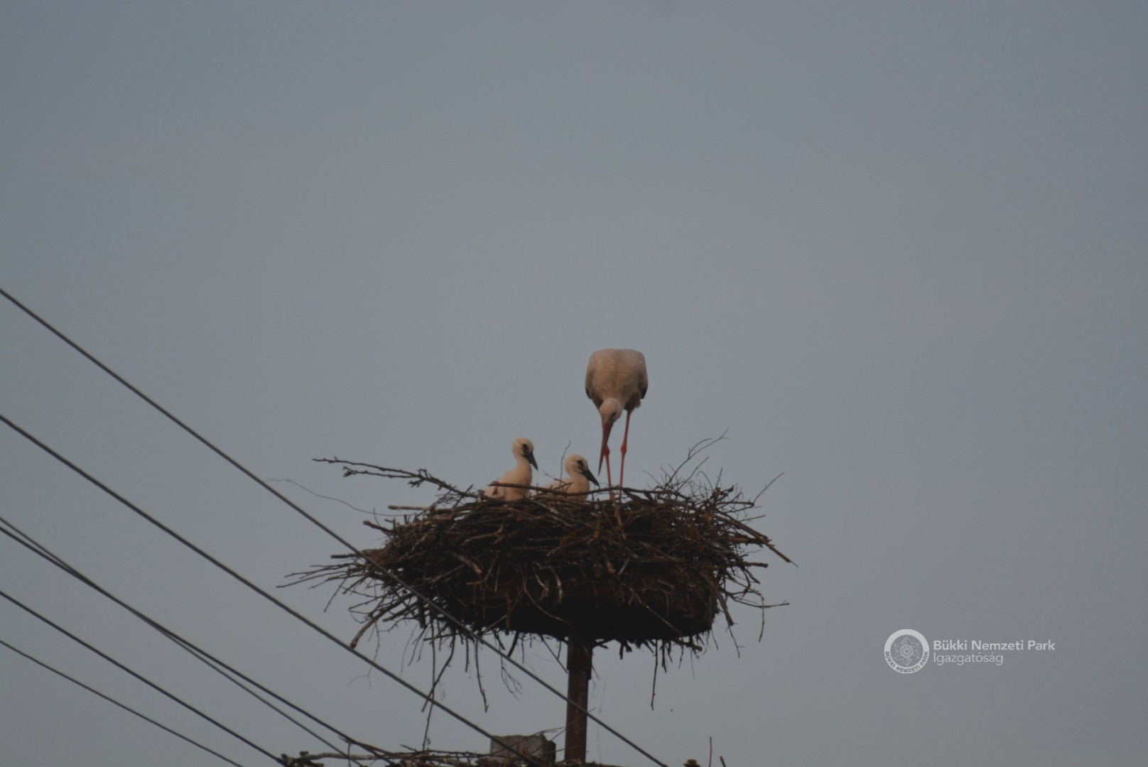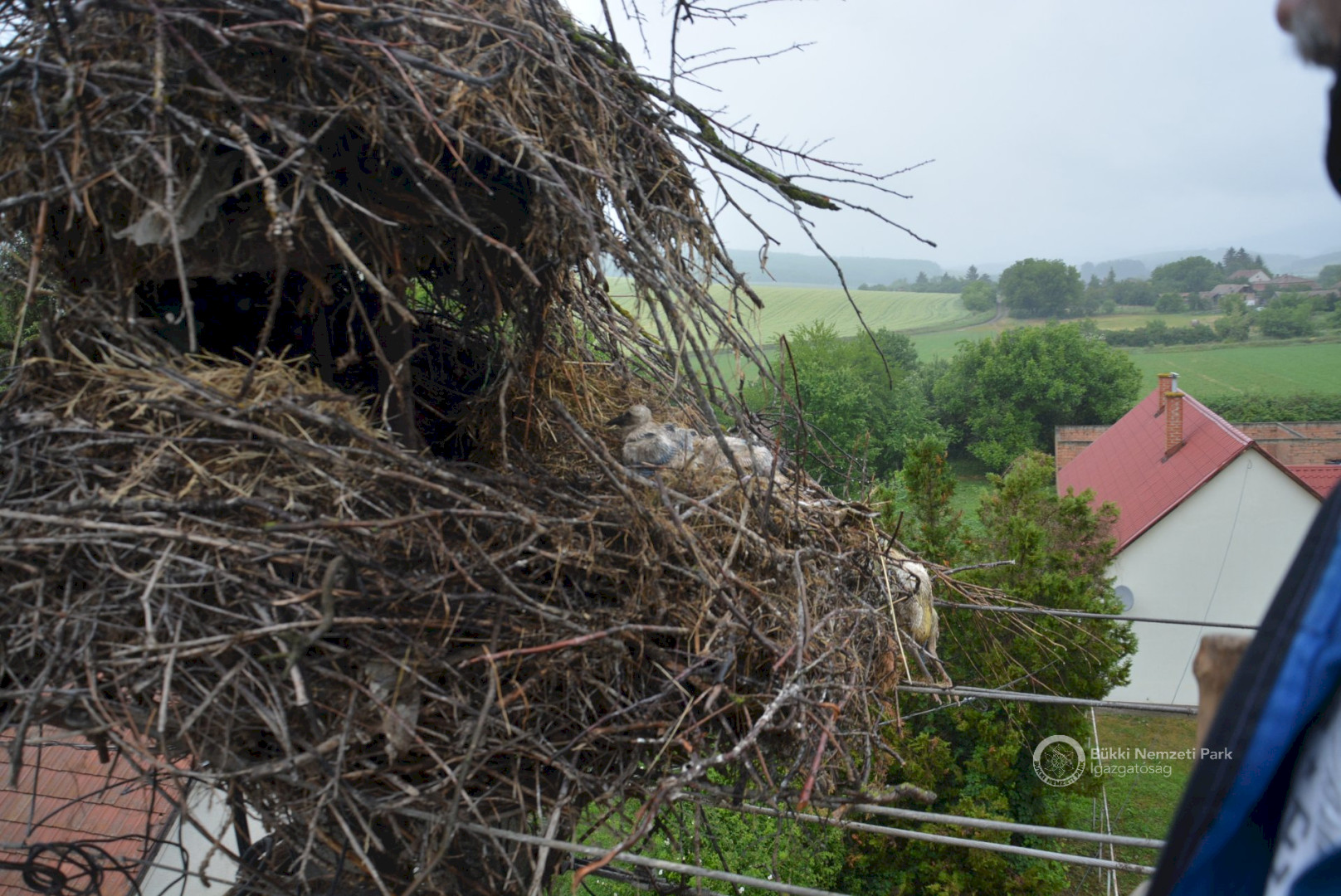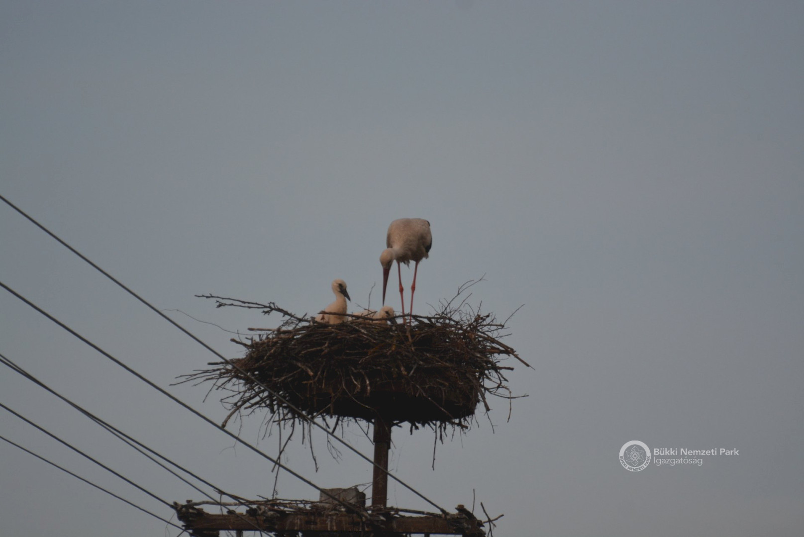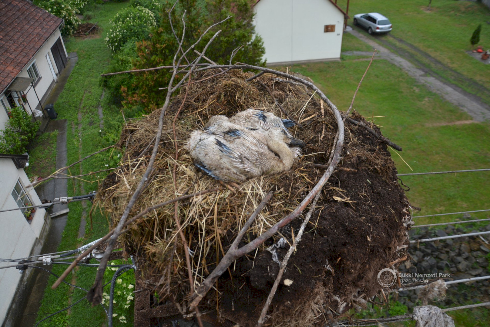Sajnos a négyből az egyik fióka kiesett, egy másik pedig a fészekanyagban, illetve a vezetékekben akadt fenn, így mindketten elpusztultak. Viszont a két kisebb fészektestvérük benne maradt a megdőlt fészekcsészében. Néha kisebbnek lenni is lehet előny... A riasztás után a Nógrádi tájegység felvette a kapcsolatot az MVM-ÉMÁSZ-szal és egy emelőkosaras gépjármű formájában meg is érkezett a segítség. Az áramtalanítás után először a fiókákat helyeztük biztonságba, majd a fészekanyag leszakadt részeit távolítottuk el. Ezután a fészektartón lévő megmaradt fészekanyag mennyiségét csökkentettük az optimális szintre, és egy új fészekcsészét alakítottunk ki benne, ahová visszahelyeztük a két életben maradt fiókát. Az öreg madarak végig figyelték a mentési, helyreállítási mozzanatokat, majd ők maguk is hordani kezdték a fészekanyagot.