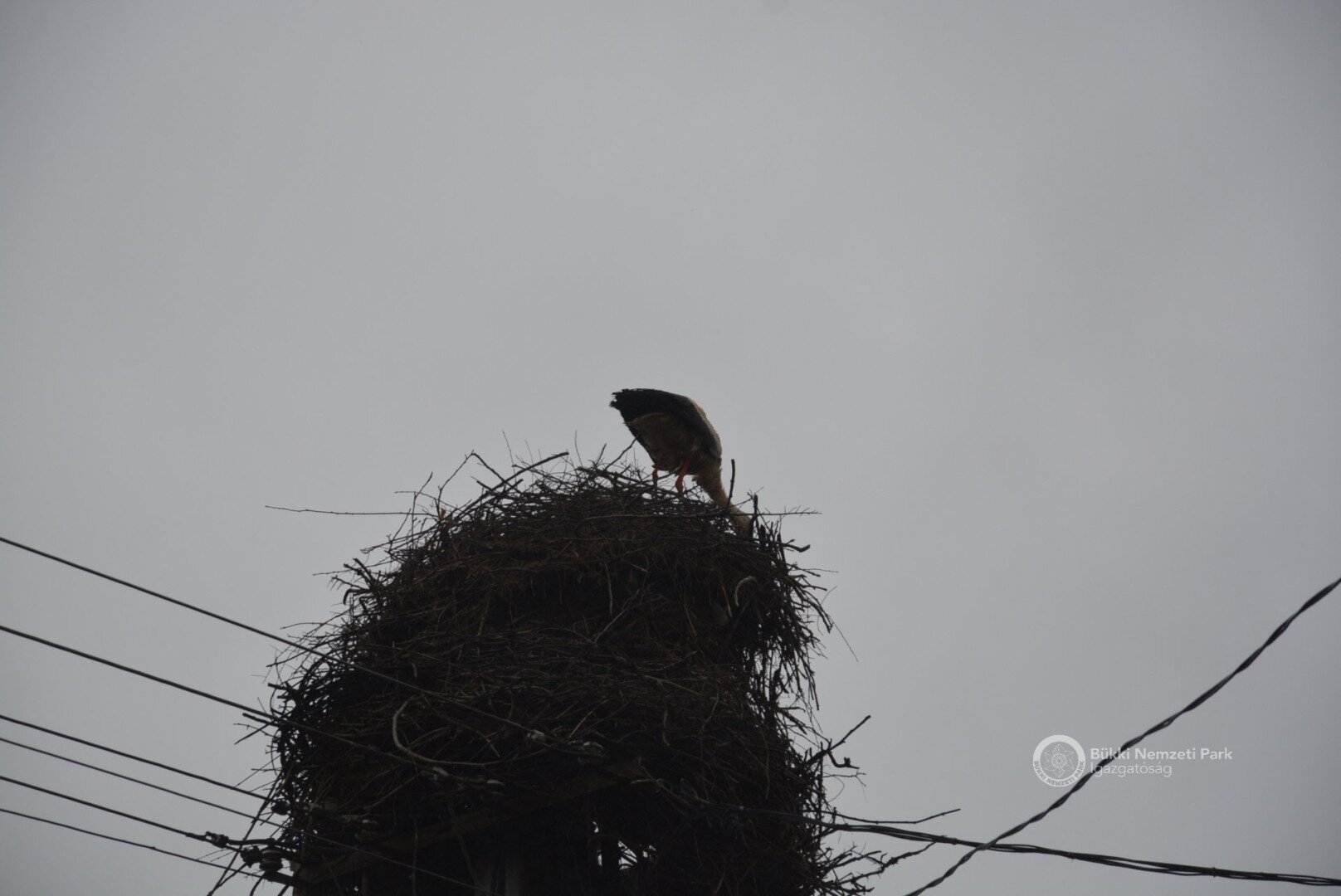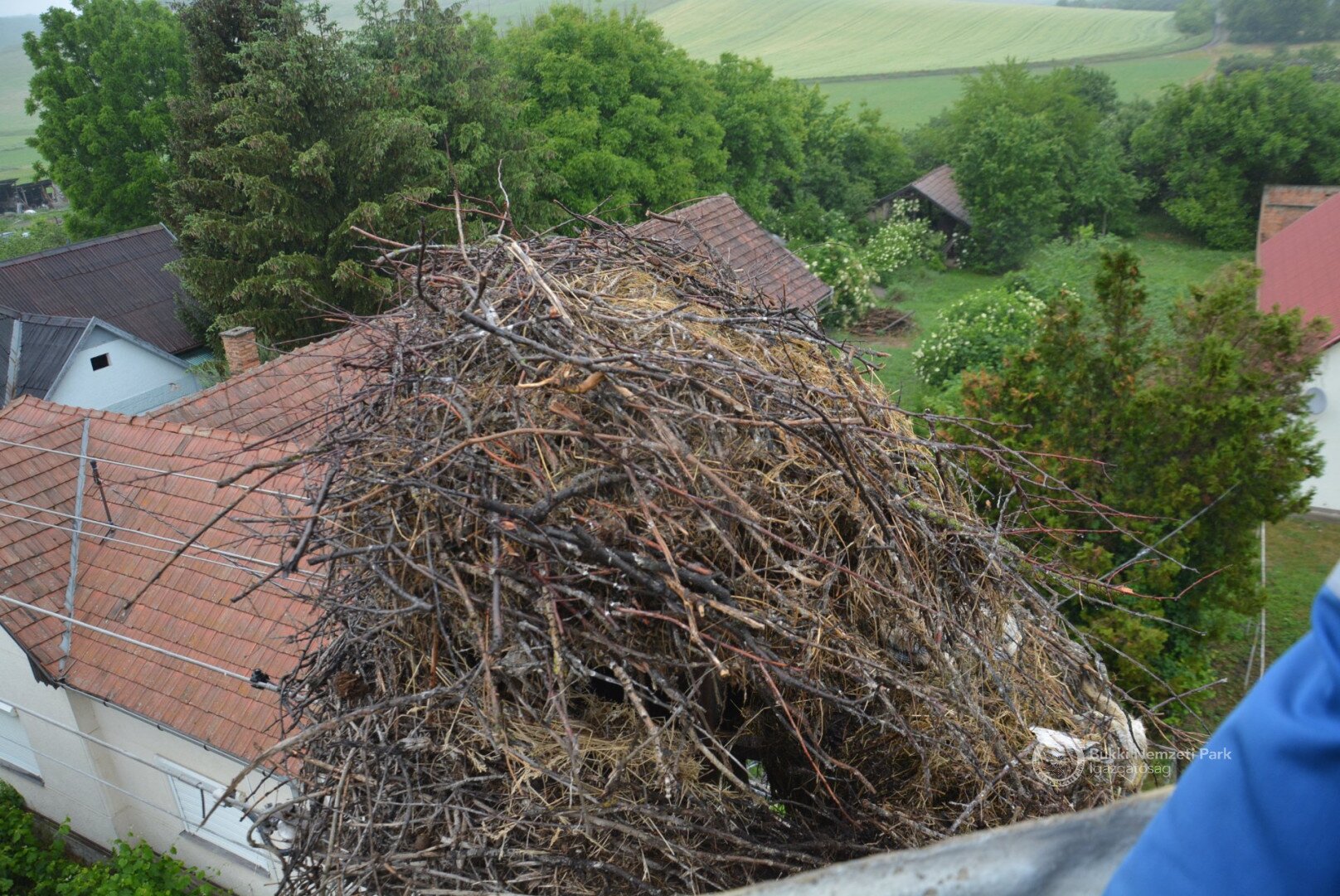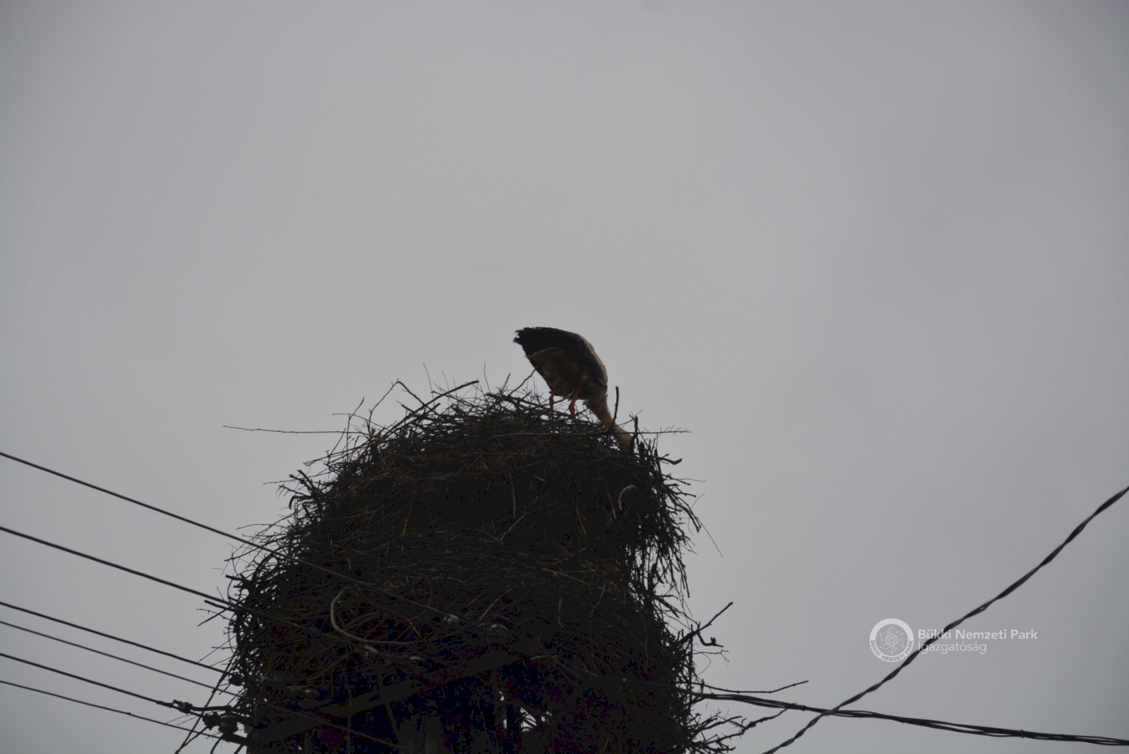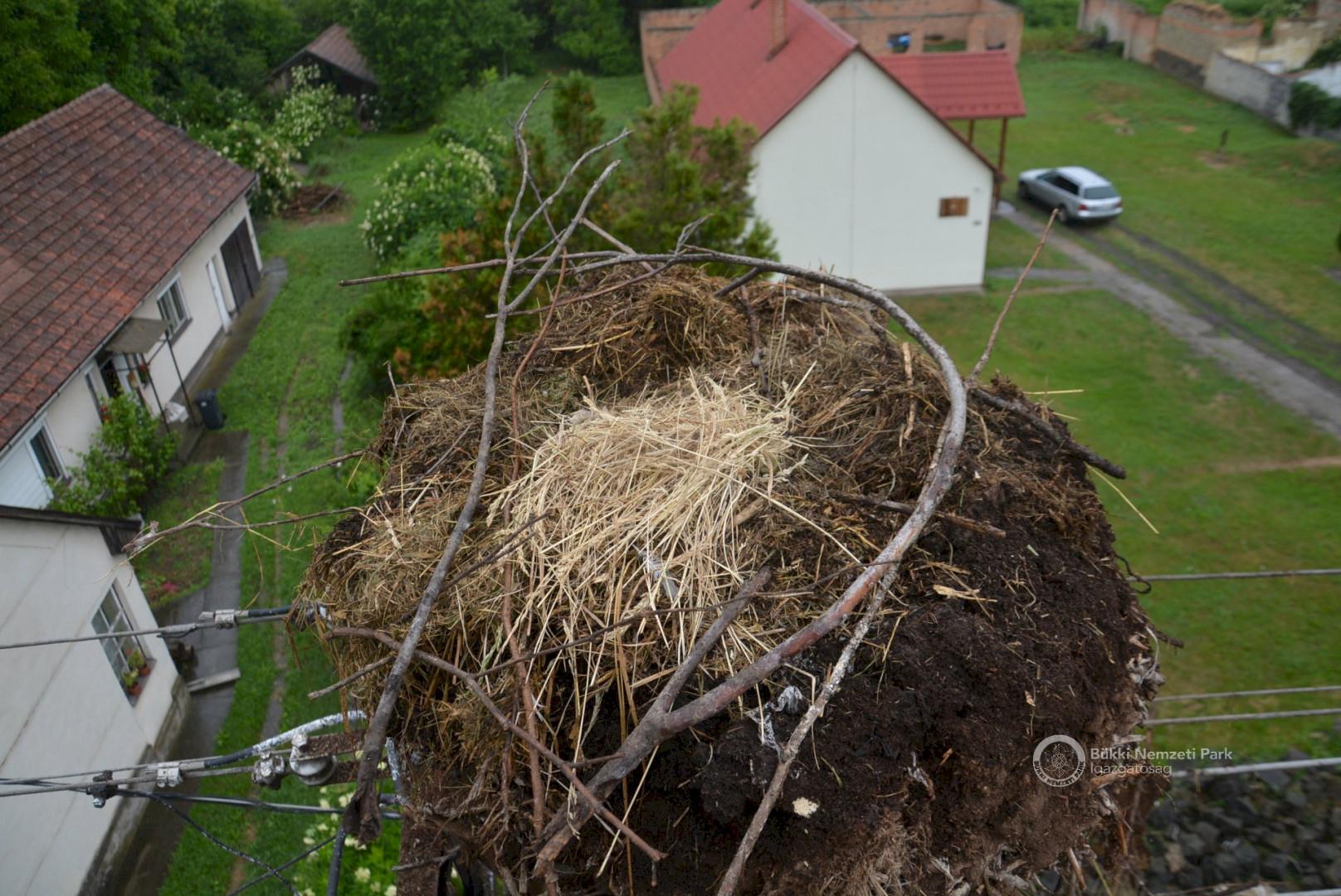 Sajnos a négyből az egyik fióka kiesett, egy másik pedig a fészekanyagban, illetve a vezetékekben akadt fenn, így mindketten elpusztultak. Viszont a két kisebb fészektestvérük benne maradt a megdőlt fészekcsészében. Néha kisebbnek lenni is lehet előny... A riasztás után a Nógrádi tájegység felvette a kapcsolatot az MVM-ÉMÁSZ-szal és egy emelőkosaras gépjármű formájában meg is érkezett a segítség. Az áramtalanítás után először a fiókákat helyeztük biztonságba, majd a fészekanyag leszakadt részeit távolítottuk el. Ezután a fészektartón lévő megmaradt fészekanyag mennyiségét csökkentettük az optimális szintre, és egy új fészekcsészét alakítottunk ki benne, ahová visszahelyeztük a két életben maradt fiókát. Az öreg madarak végig figyelték a mentési, helyreállítási mozzanatokat, majd ők maguk is hordani kezdték a fészekanyagot.