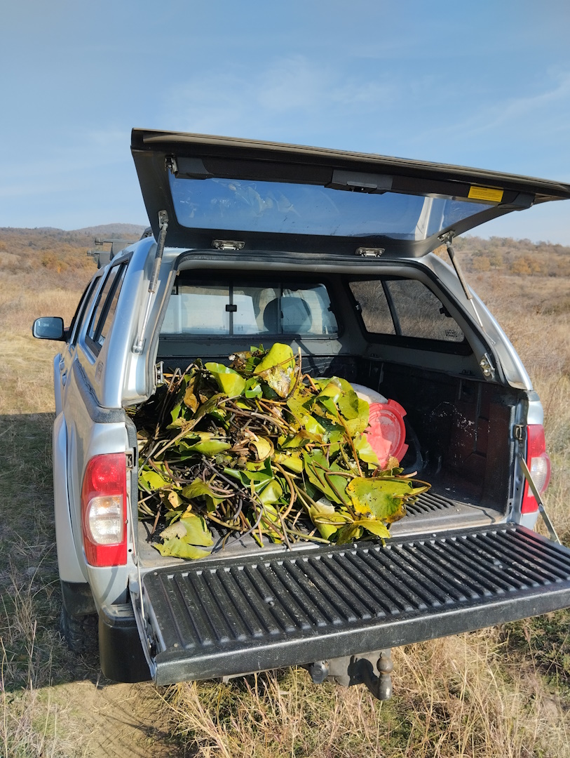 A kézzel kigyomlált tündérrózsa (Nymphaea sp.), háttérben a törpeharcsákat (Ameiurus sp.) tartalmazó hordóval. Fotó: Nagy Laura