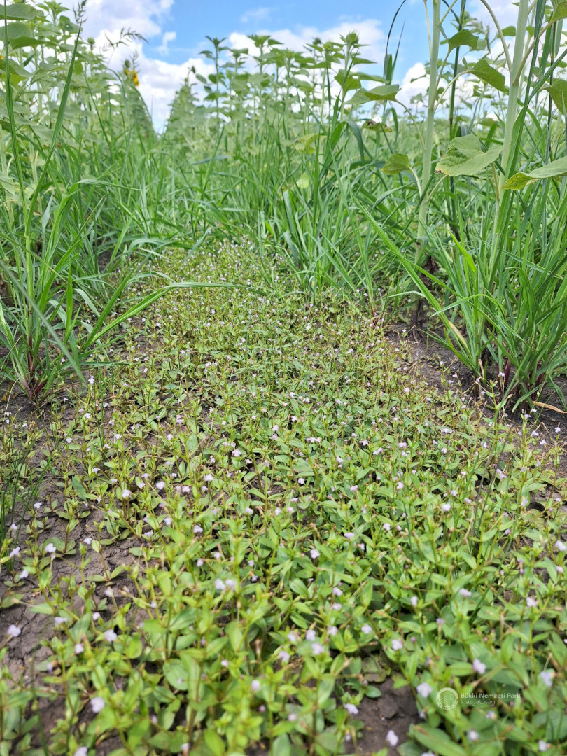 Apró iszapnövényzet (előtérben) és közönséges kakaslábfű (Echinochloa crus-galli) tömege nyílt felszíneken