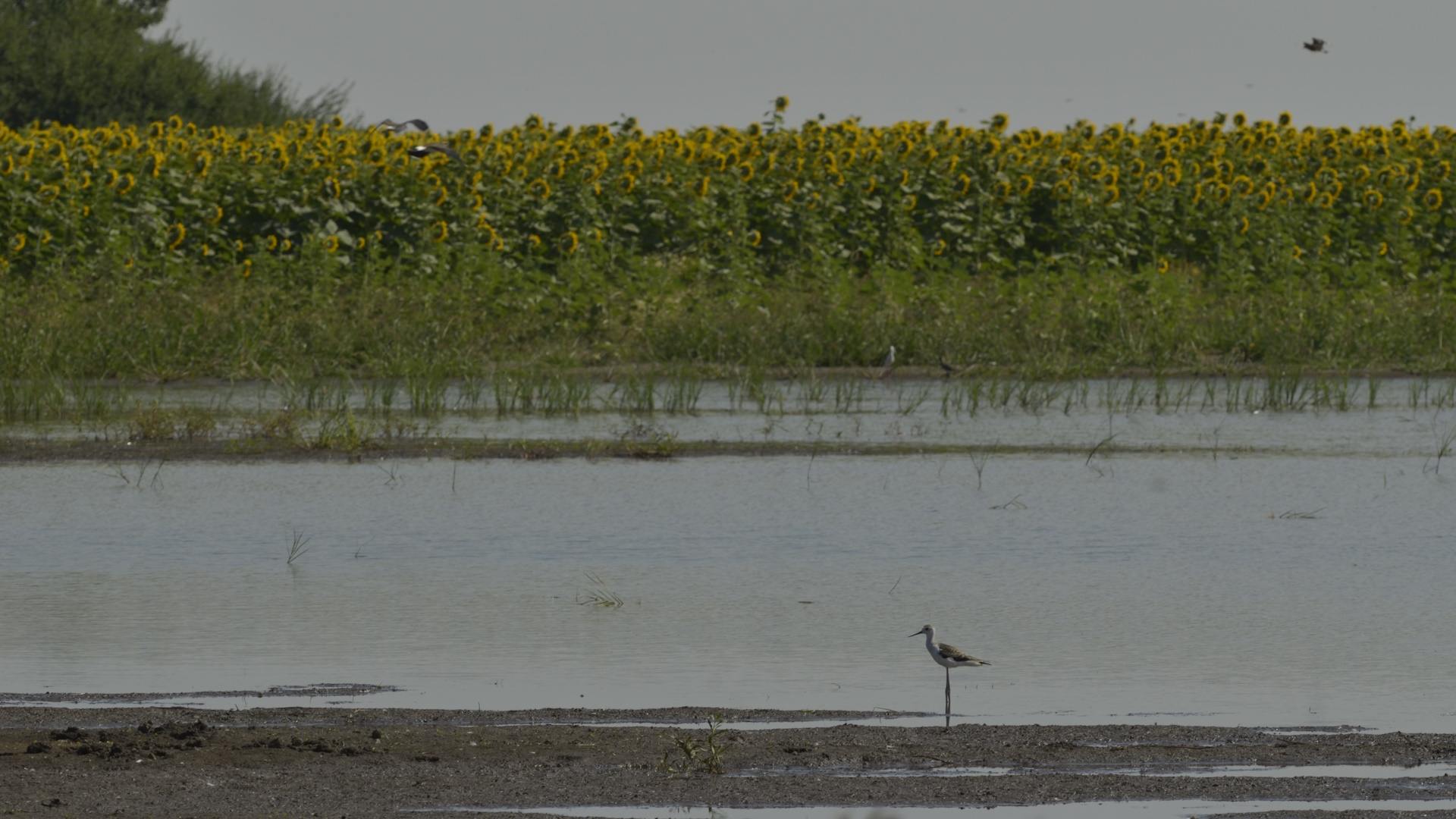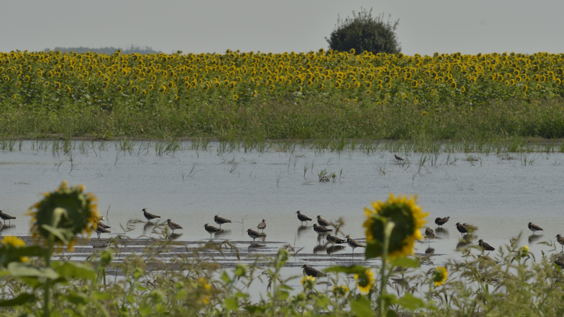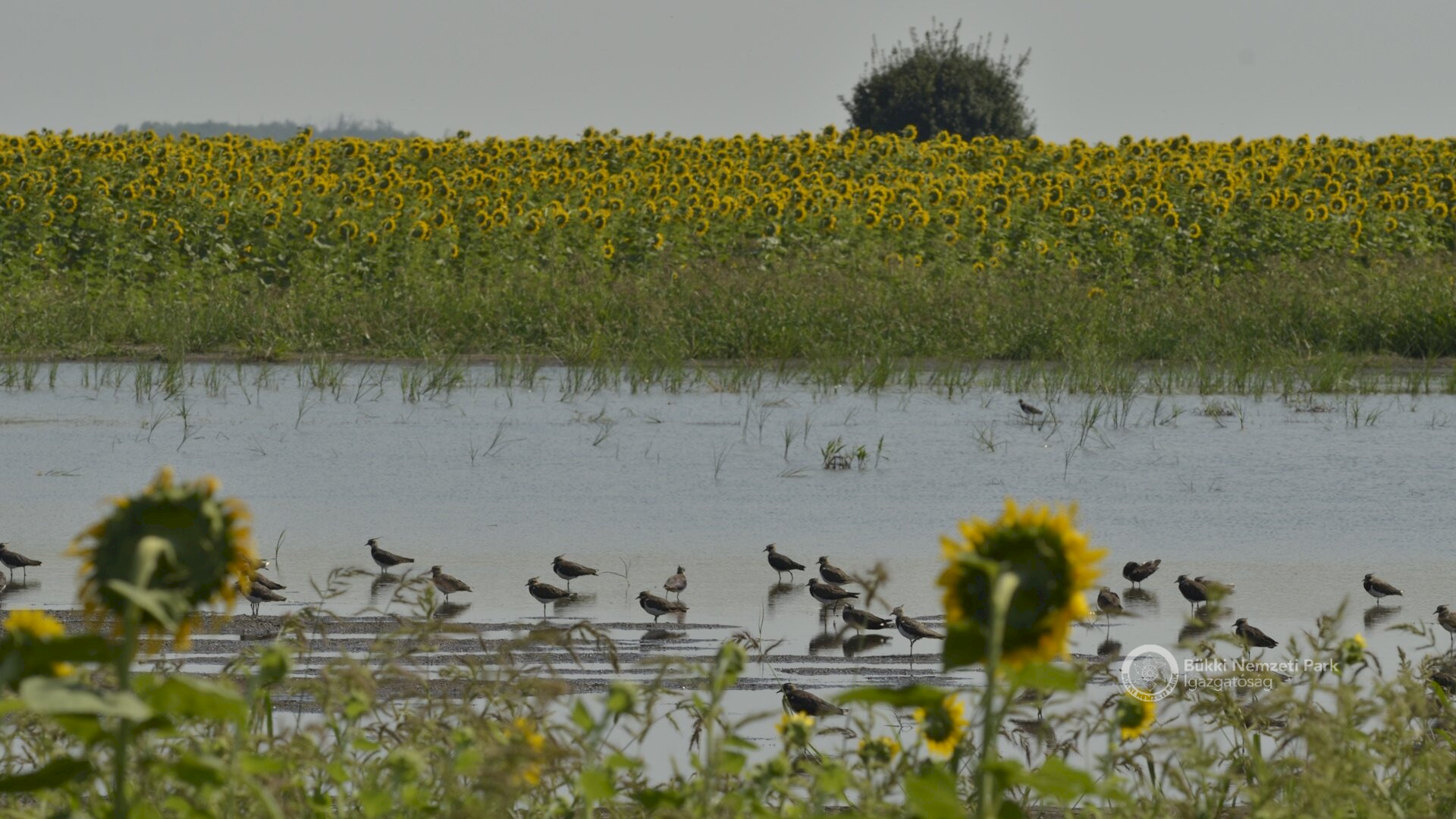 Pihenő bíbicek (Vanellus vanellus) napraforgó vetésben kialakult belvízfoltban Csány mellett
