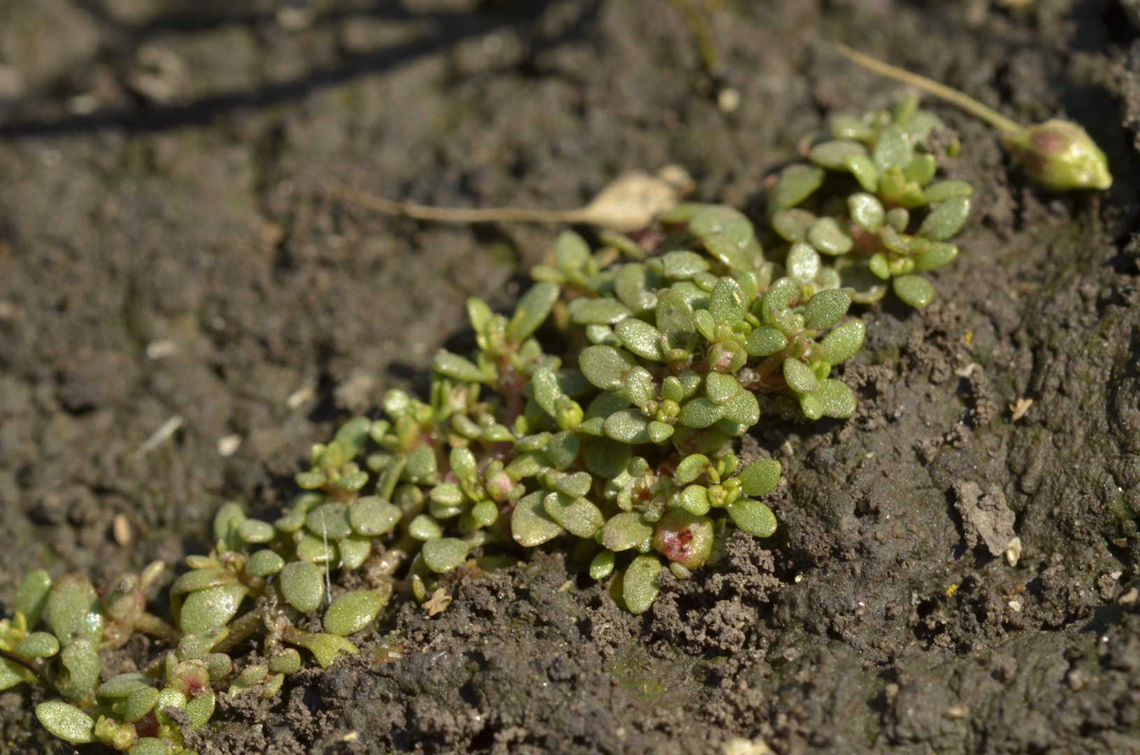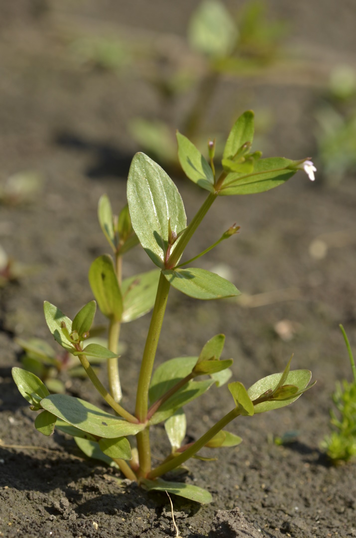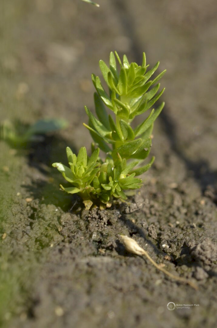 Pár centiméteres pocsolyalátonya (Elatine alsinastrum) növényke nedves felszínen