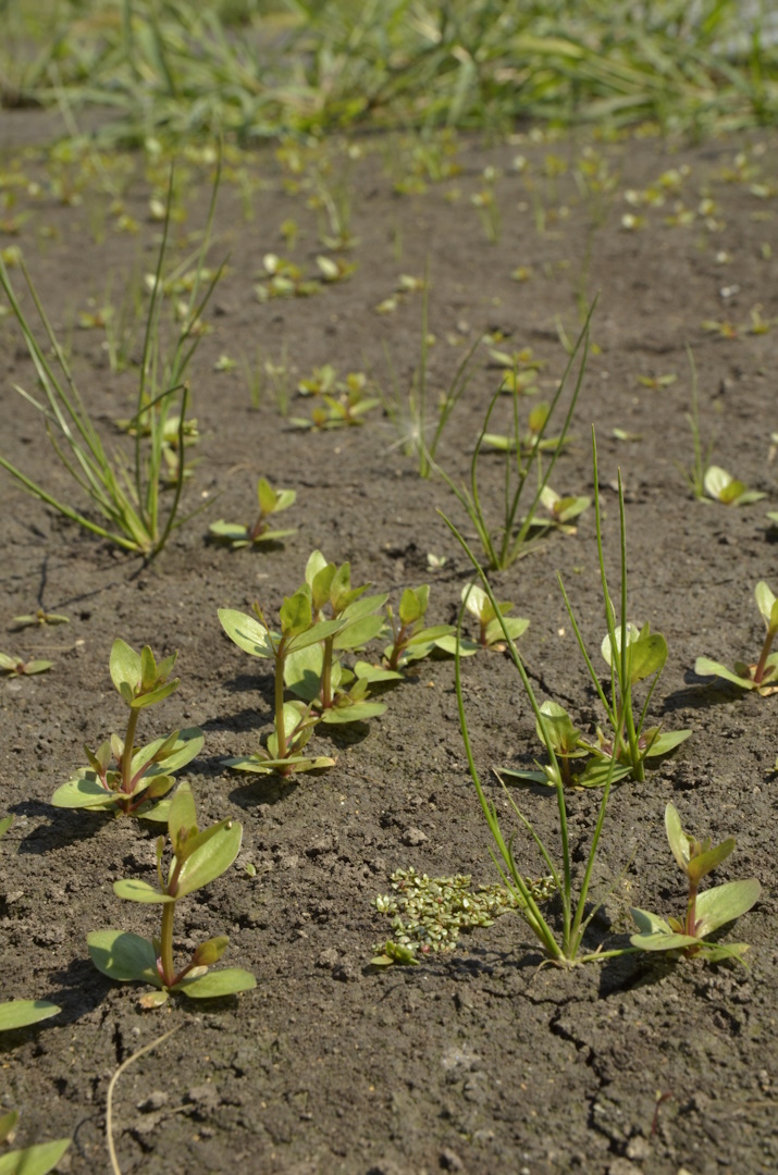 A henye pimpó (Potentilla supina) a gyakoribb fajok közé tartozik, lecsepült hajtásaiból rikítanak sárga virágai. Sokaknak nem szembetűnő, nem figyelemfelkeltő növény a henye káka (Schoenoplectus supinus), ám az ő jelenléte már arra utal, érdemes lehajolni és az iszapfelszínen nyitott szemmel keresgélni. Ez esetben rálelhetünk a védett magyar látonya (Elatine hungarica) aprócska telepeire. Ez az aprócska növényfaj a Tisza ártérén kedvező évben nagyméretű, akár fél méter átmérőjű telepeket hozhat létre. Jelen esetben a deciméteres foltoknak is rendkívül örültünk, bár a többségük csak pár centiméteres volt. Másik védett látonyafajunk, a pocsolyalátonya (Elatine alsinastrum) is előkerült. Ez a faj rokonaihoz képest egyébként termetes méretű lehet, akár 10-30 cm magasra is megnőhet, megtalálásakor még csak aprócska hajtásait láthattuk. Nem így volt a heverő iszapfűvel (Lindernia procumbens). A leszáradó felszíneken megjelenő aprócska növényfaj egészen nagy mennyiségben csírázhat és virágozhat, a mezőgazdasági parcella soraiban kisebb mezőket alkotó foltjai a laikusokkal is megszerettetik az iszapnövényeket.