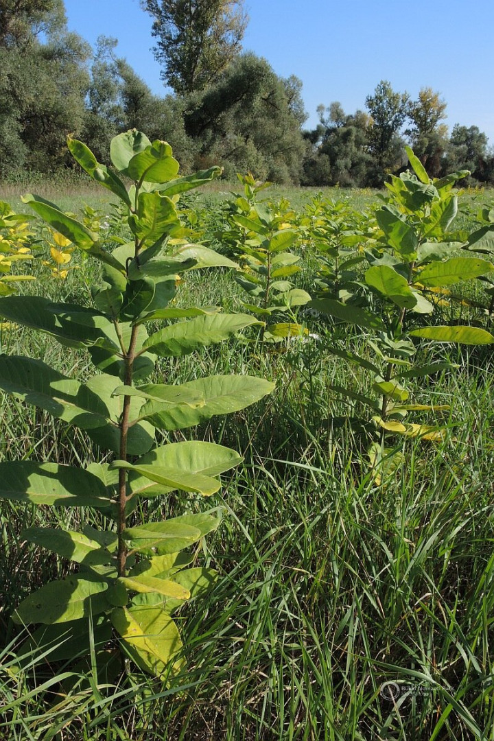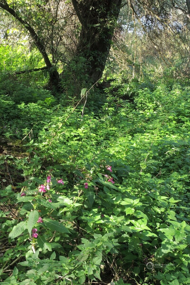 Ha bemerészkedünk a csalános aljú fák közé, meglepve láthatjuk, hogy a zöldben egy impozáns megjelenésű, bíboribolya színű lágyszárú tarkállik. Ő a bíbor nebáncsvirág (Impatiens glandulifera) és a Himalája vidékéről emberi segítséggel érkezett hozzánk. A faágak közül a földekre kitekintve még egy amerikai betolakodó megtelepedésének lehetünk tanúi: a vaddohányként is ismert selyemkóró (Asclepias syriaca) az. Széles, élénkzöld leveleivel, nagy illatos virágzatával mutatós növény, nem csoda hát, hogy ő is díszítő értéke révén jutott el Európába. Mélyre lehatoló gyökere, ősz végére felnyíló tokterméséből messzire repülő magjai segítségével pillanatok alatt leuralja a vidéket. Nagyon nehéz megszabadulni tőle, az csak vegyszer segítségével évekig tartó erőfeszítéssel lehetséges.