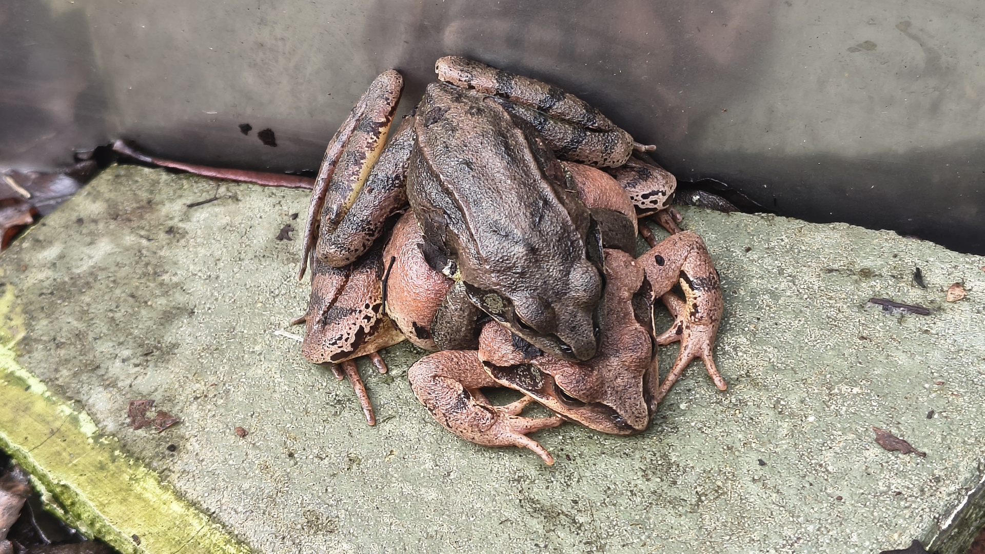 A vándorlás elején még 1:1 az ivararány. Egy-egy megtermett nőstény egy-egy kisebb hím barna varangyot cipel