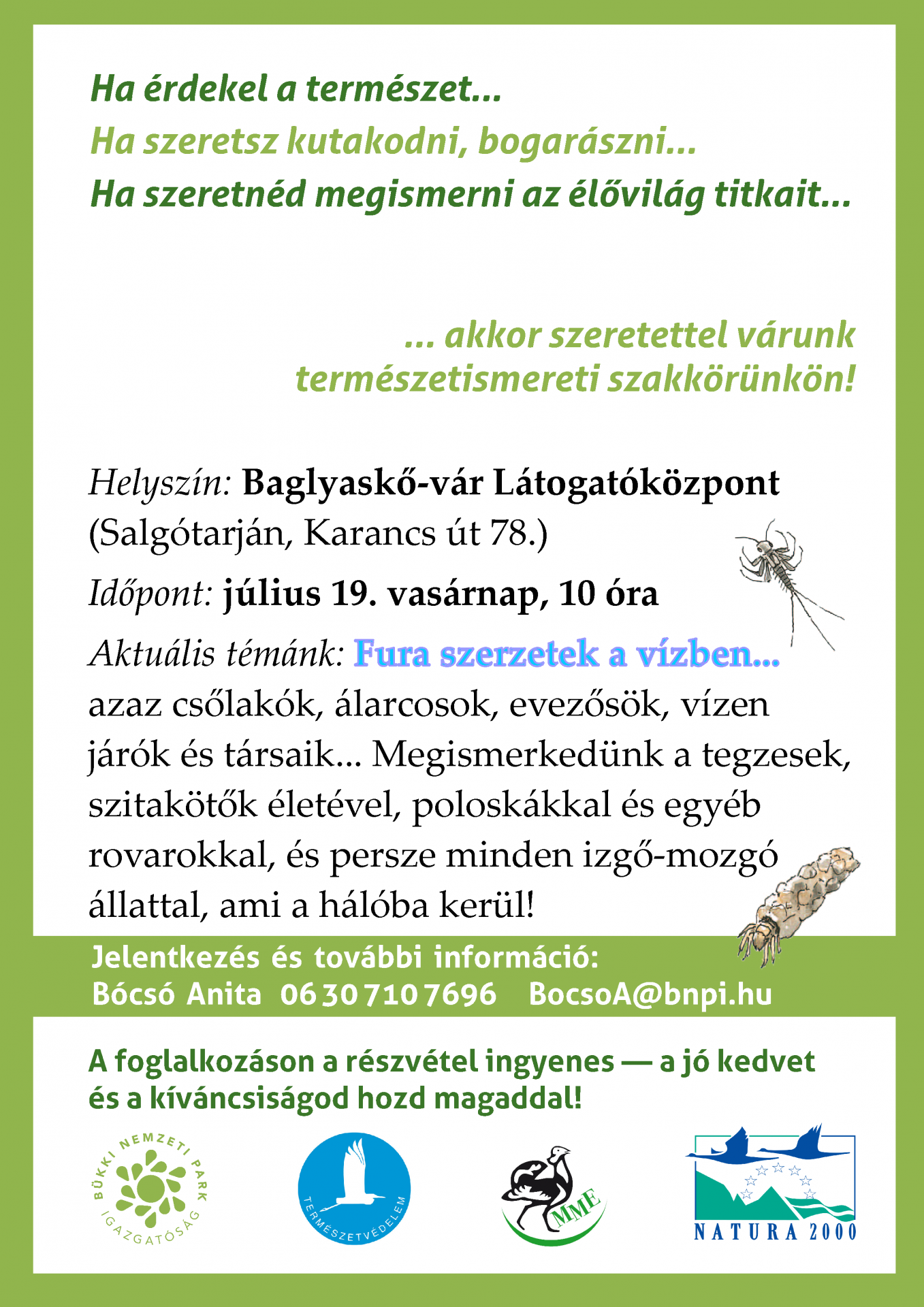 azaz csőlakók, álarcosok, evezősök, vízen járók és társaik....Megismerkedünk a tegzesek, szitakötők életével, poloskákkal és egyéb rovarokkal, és persze minden izgő-mozgó állattal, ami a hálóba kerül.