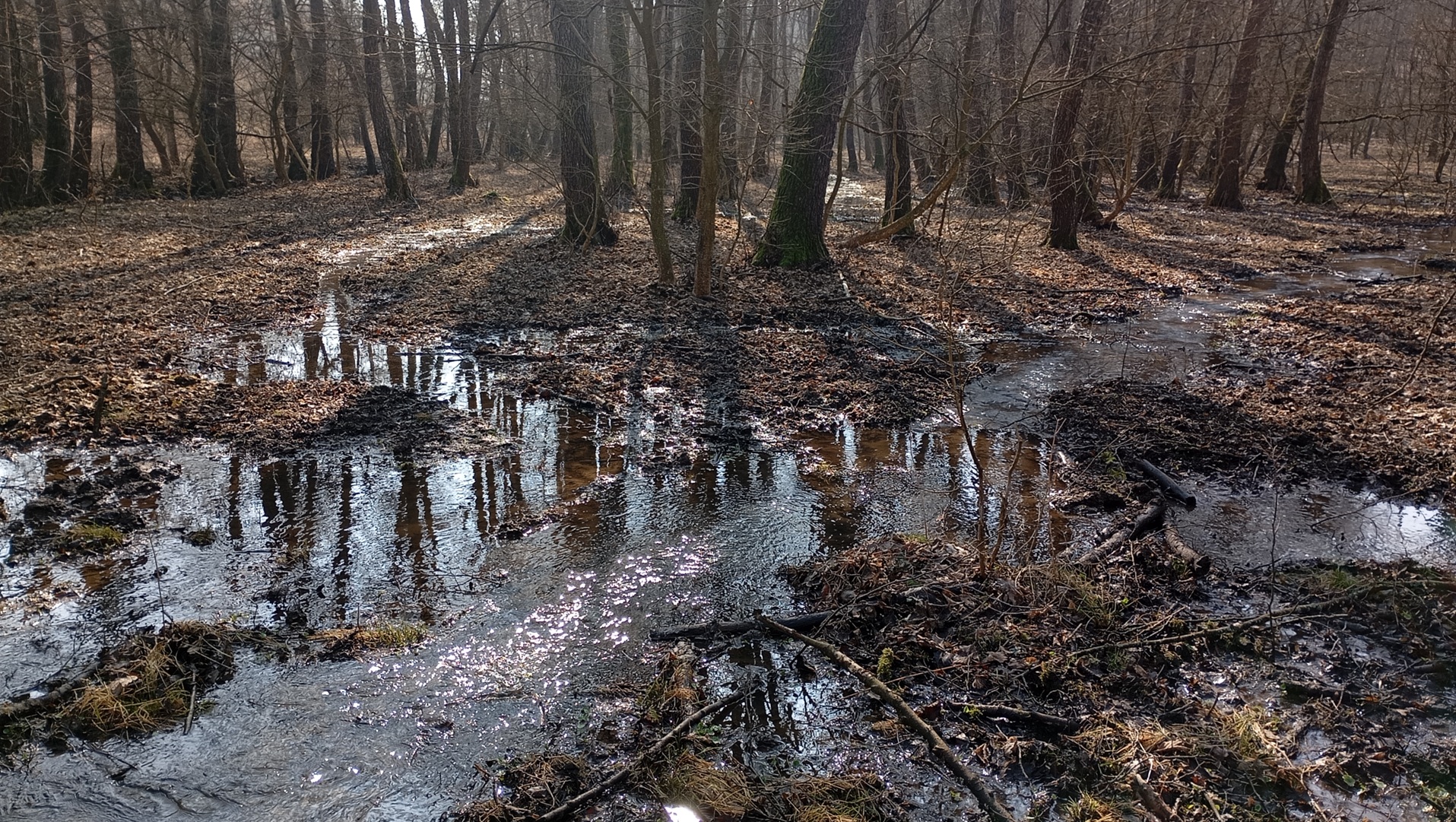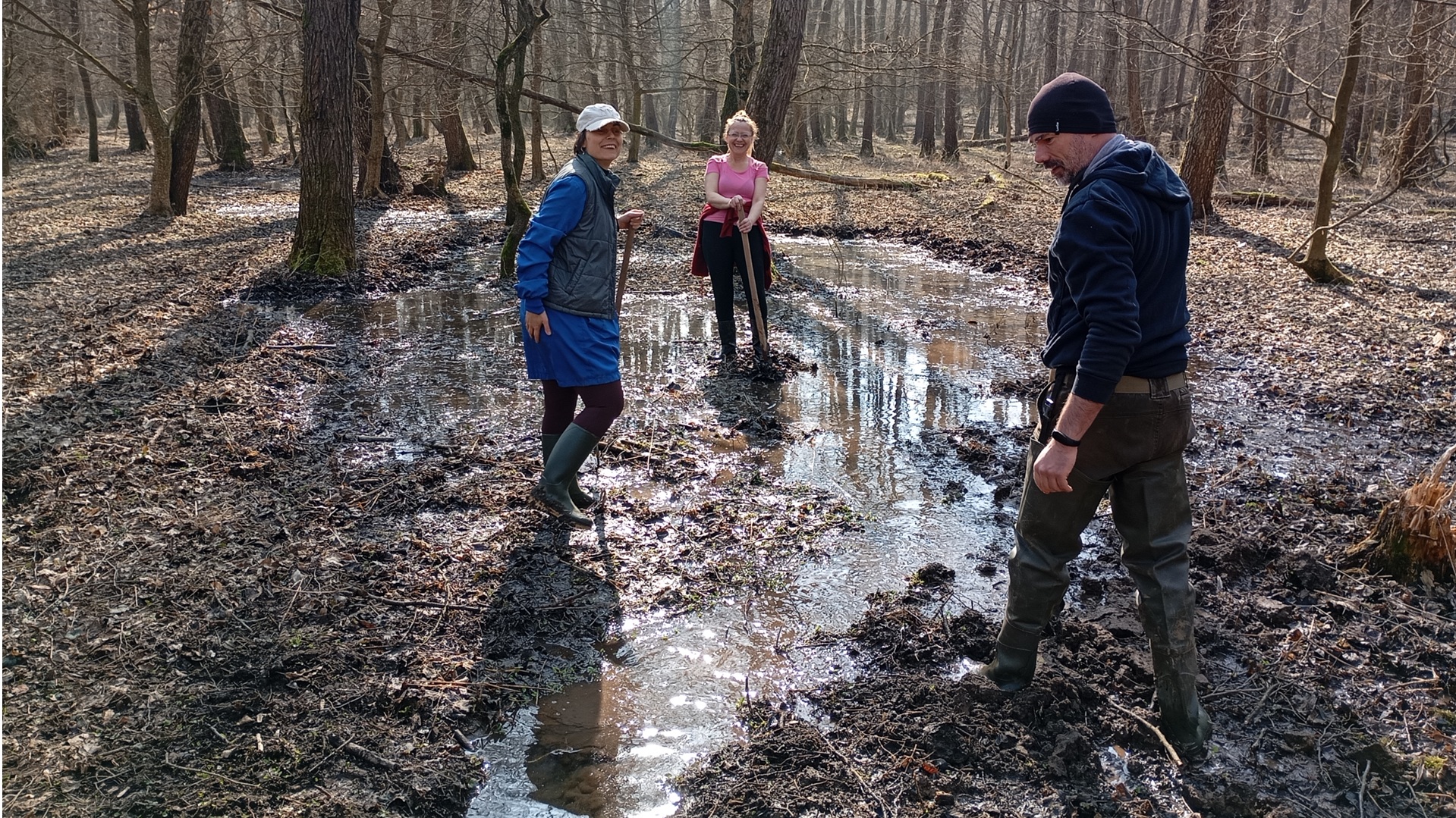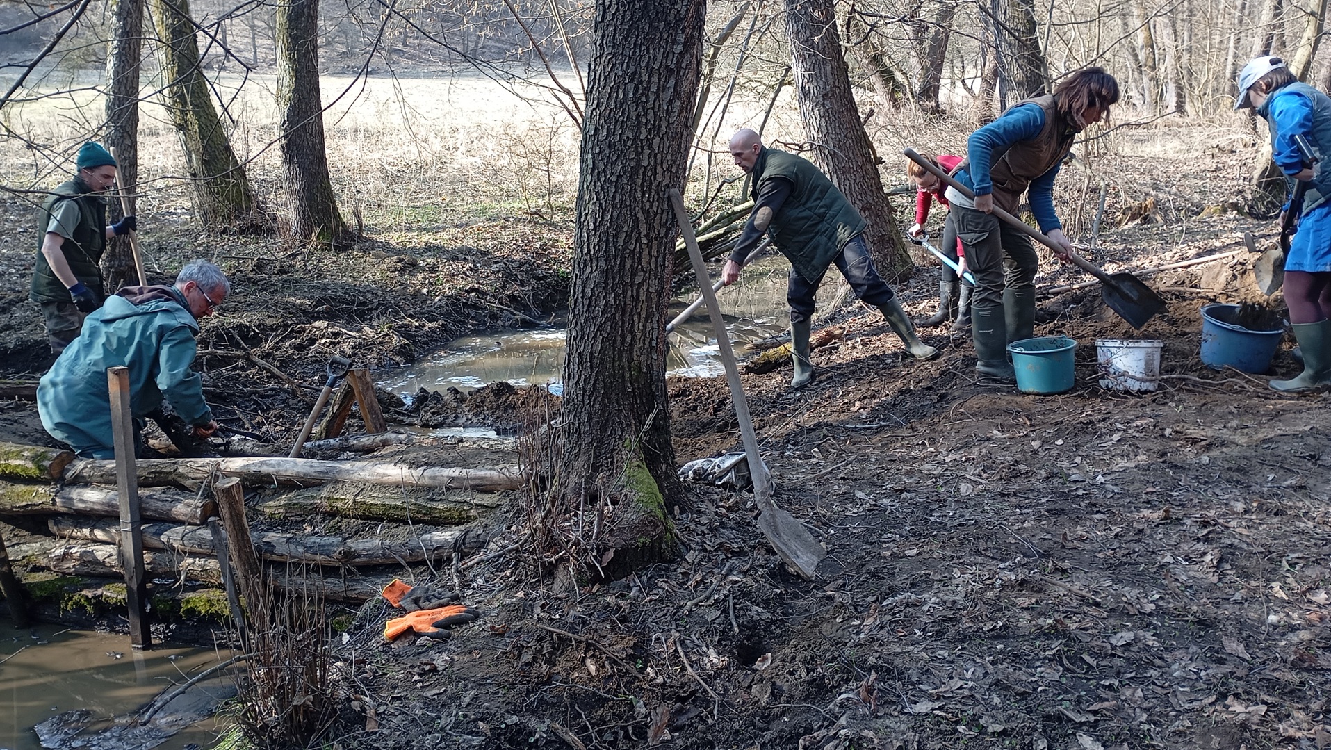 2026. március 4-i tevékenységünk során egy égeres mocsarat segítettünk meg a berágódott patakmeder fenékszintjének emelésével, illetve szivárgó rönkgátak által duzzasztott víz kivezetésével. Az eredmények gyorsak és látványosak: az égeresbe áramló víz pillanatok alatt megtöltötte a kisebb-nagyobb medencéket, és most már rakoncátlanul csordogál, amerre csak utat talál magának. Ezt látva könnyebb elképzelni, hogyan is nézhetett ki ez a táj a patakszabályozást megelőzően.